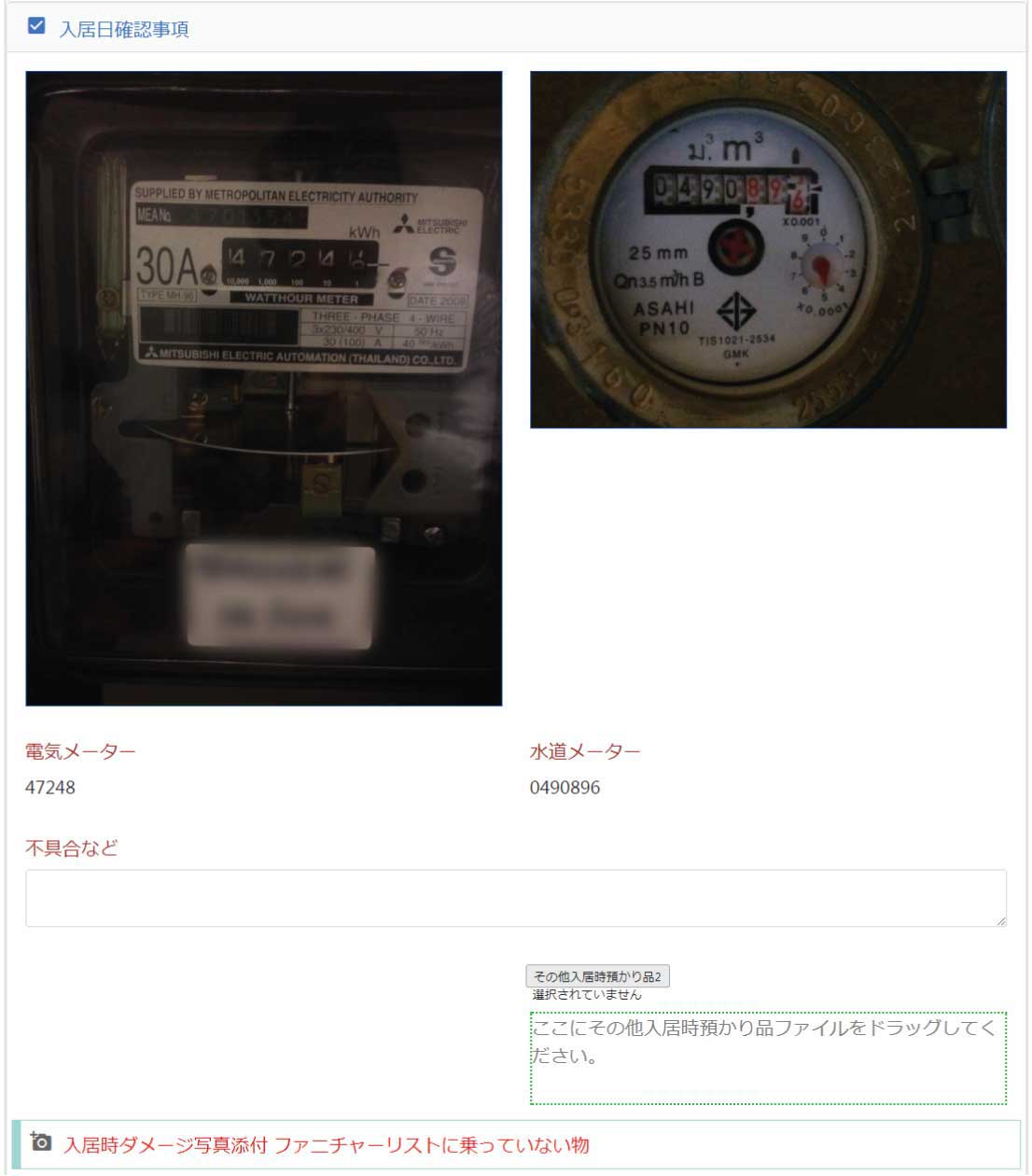 入居日の水道や電気メーターについての記入欄です。
