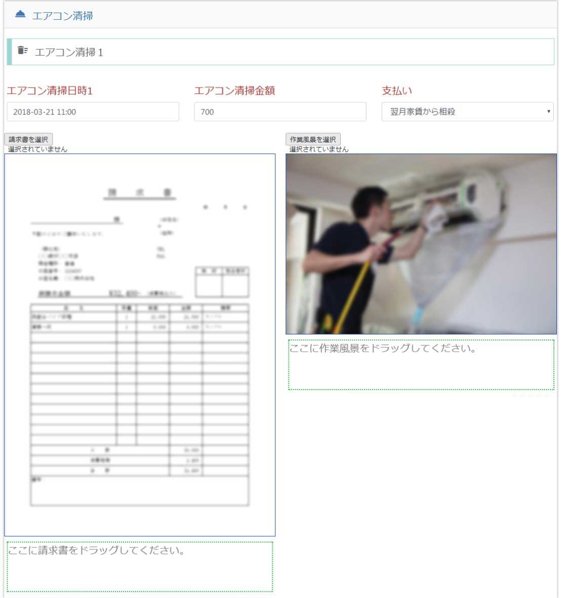 エアコンの清掃日時、清掃金額が記入されます。請求書と作業風景のファイルもこちらに添付されます。